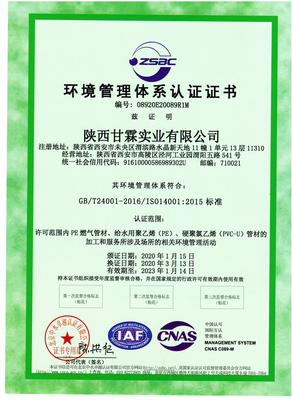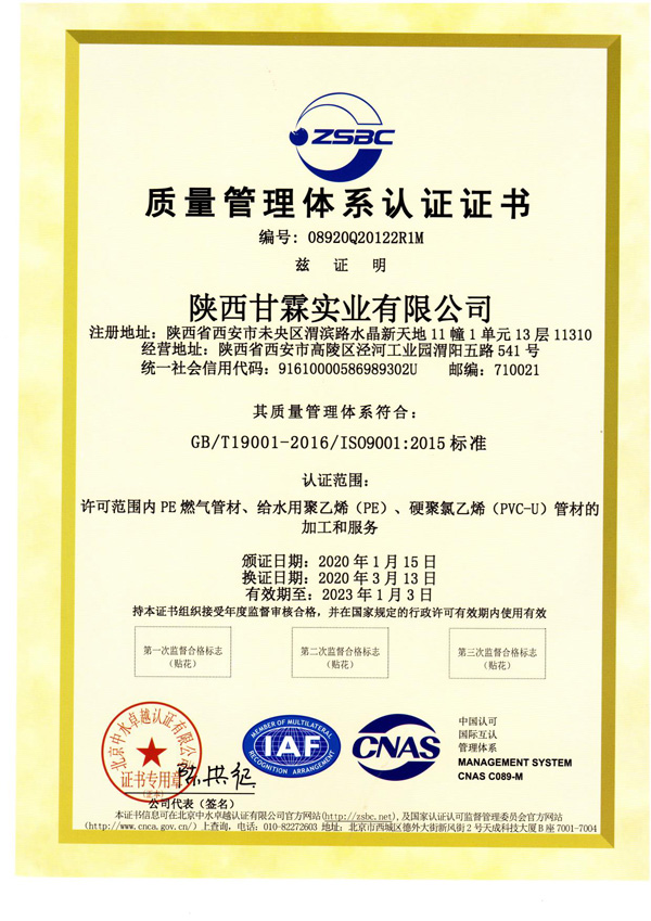 陜西甘霖實業有限公司是一家主要從事各類塑料管材管件的研發、生產、銷售為一體的高新技術企業。企業從各種原輔材料入廠檢驗開始,直至產成品下線出廠檢驗,全部采用完善的管理體系和先進的生產設備和檢測標準,產品各項品質指標全部達到和高于國家標準。